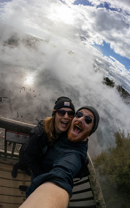 Nach diesem super Start in den Tag ging es weiter zum „Kuirau Park“, einem kostenlosen Geothermal Park. Verschiedene Pfade führten uns durch das große Areal. Überall dampfte und sprudelte es um uns herum. In den umzäunten Pools hat das Wasser eine Temperatur von 100 Grad Celsius. Betreten ist natürlich strengstens verboten, da es zu Verbrühungen kommen kann. Der Geruch ist gewöhnungsbedürftig. Teilweise stank es so sehr, dass wir uns die Nasen zuhalten mussten. Trotzdem ist es schon irgendwie verrückt zu sehen, was die Natur hervorbringt und mit welche Hitze sie hier an die Erdoberfläche tritt. Es erinnerte uns stark an unseren Besuch bei den „Craters of the Moon“. Dort kam der Dampf allerdings eher aus Felsspalten und hier gibt es richtige heiße Quellen. Nach weiteren Pools, viel dichtem Wasserdampf und blubbernden Schlammlöchern machten wir uns wieder auf den Heimweg. Ein schöner Tag, der uns vor allem dank der süßen Hasen in Erinnerung bleiben wird.
