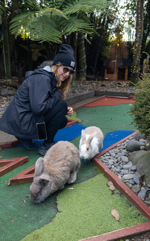 Bei strahlendem Sonnenschein machten wir uns heute auf Entdeckungstour. Wir waren schon zu Beginn der Reise in dieser Region um den Lake Taupo unterwegs und kennen uns schon ein bisschen aus. In der gesamten Region gibt es geothermische Felder, die zur Energiegewinnung und in Thermalbädern genutzt werden. Aufs Baden hatten wir nicht so richtig Lust, da uns der Preis und der Schwefelgeruch des heißen Wassers eher abschreckte. Wir entdeckten aber in der Nähe eine Minigolfanlage und entschieden uns dafür. Das Beste dabei: Hasen. Auf der ganzen Minigolfanlage hüpfen flämische Hasen herum, die man streicheln darf. Für mich als passionierte Kaninchen und Hasen- Liebhaberin der Traum!