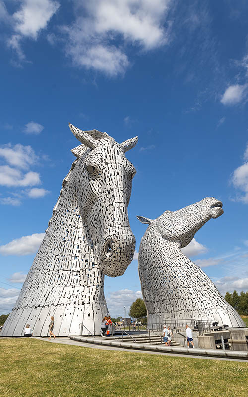 Die „Kelpies“ sind zwei 30 Meter hohe Stahlskulpturen in Pferdeform. Wir sahen sie schon von Weitem und waren froh, noch einen der wenigen Parkplätze am Besucherzentrum zu ergattern. Als Kelpie bezeichnet man in Schottland Wassergeister in Pferdegestalt. Der Bildhauer Andy Scott hat die beiden gigantischen Skulpturen aus unterschiedlich geformten Edelstahlplatten auf einem Stahlgestell errichtet. Sie stehen für die Bedeutung von Pferden und ihrer Zugkraft zu Beginn der wirtschaftlichen Entwicklung in der Region. Eine schöne Hommage und zwei wirklich beeindruckende Stücke! Hier hat es uns sehr gut gefallen. Nach einer kleinen Kaffeepause an einem der Verkaufsstände brachen wir noch zu der Stadt Dunfermline auf.