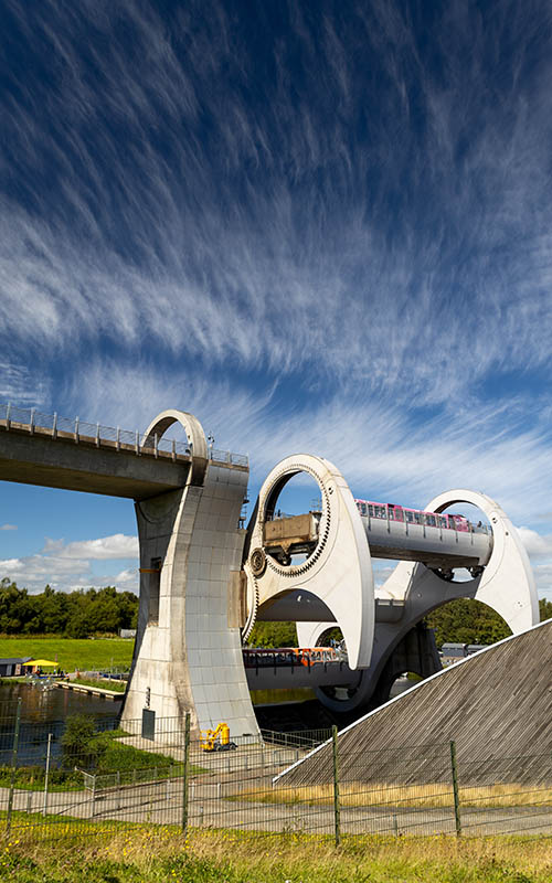 Wir haben beschlossen, uns noch ein wenig die Umgebung um Edinburgh und Glasgow anzusehen. Deshalb fuhren wir heute in ländlichere Regionen und entflohen den großen Touristenströmen der Städte. Unseren ersten Stopp machten wir beim „Falkirk Wheel“, einem modernen Schiffshebewerk. Der 35 Meter hohe Bau ist nicht nur optisch beeindruckend. Aufgrund seiner Konstruktion, die wie eine Art Riesenrad funktioniert, ist es weltweit einmalig. Das Hebewerk, das es seit Ende der neunziger Jahre gibt, wird größtenteils für touristische Zwecke verwendet. So kann man dort Bootstouren buchen und sich per Hebewerk in den 24 Meter höher liegenden Kanal transportieren lassen. Eine wirklich erstaunliche Erfindung! Wenn man nicht an einer Bootsfahrt interessiert ist, gibt es vor Ort allerdings nicht viel mehr zu machen und so brachen wir zu unserem nächsten Ziel auf.