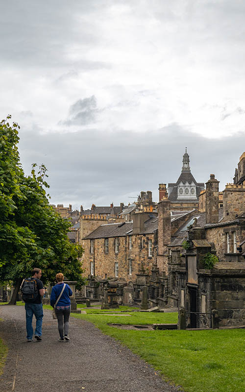 Weiter ging es zum „Greyfriars Kirkyard Cemetary“. Dieser ist sowohl als Harry Potter Schauplatz, als auch für seine kuriose Legende um den Hund Bobby bekannt. Der Terrier Bobby wurde durch seine Treue zu seinem Herrchen zur Legende. Angeblich verbrachte er 14 Jahre seines Lebens am Grab seines verstorbenen Besitzers, bevor er 1872 selbst starb. Um ihn zu Ehren, wurde Bobby dort ebenfalls – eigentlich widerrechtlich – beerdigt und hat eine kleine Bronzestatue in Gedenken auf dem Kirchhof. Neben rührender Geschichte ist es vor Allem eines: ein Touristenmagnet. Statt am Friedhof hat man eher das Gefühl, auf dem Jahrmarkt zu sein. Große Führungen in allen erdenklichen Sprachen schieben sich hier über die Gehwege. Praktischerweise gibt es in der Kirche noch einen Souvenirshop, in dem man neben Hundeleckerli alle möglichen „Bobby“- Souvenirs kaufen kann. Verrückt, finden wir, scheint aber ein lohnenswertes Geschäft zu sein. Wen die Hundesaga nicht interessiert, hat ja auch noch die Harry Potter Fanbase. Hier finden sich einige bekannte Namen aus der Buchreihe. Das bekannteste Grab dürfte aber das von „Tom Riddle“ aka Lord Voldemort sein. Was wir zuerst für eine übriggebliebene Filmrequisite hielten, entpuppte sich bei späterer Recherche als echtes Grab. Thomas Riddle und sein gleichnamiger Sohn verstarben dort 1802 und 1806. Da die Autorin J. K. Rowling diesen Friedhof für ihre Bücher gewählt hat, hat sie sich wohl auch von den bereits vorhandenen Namen auf den Grabsteinen inspirieren lassen. Das National Museum of Scotland ließen wir aus und beobachteten dafür einen Jongleur, der vor dem Museum in mehreren Metern Höhe mit drei Fackeln jonglierte.