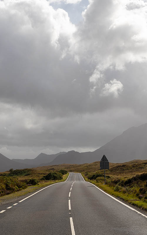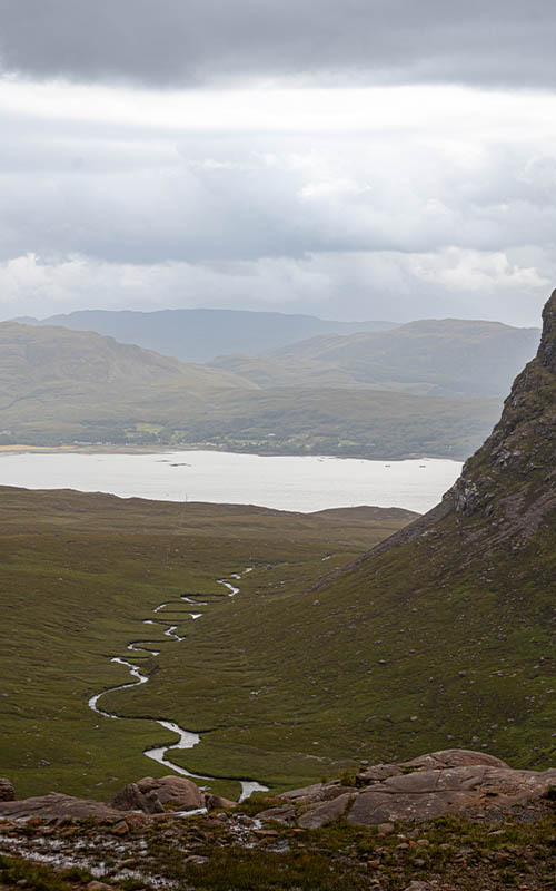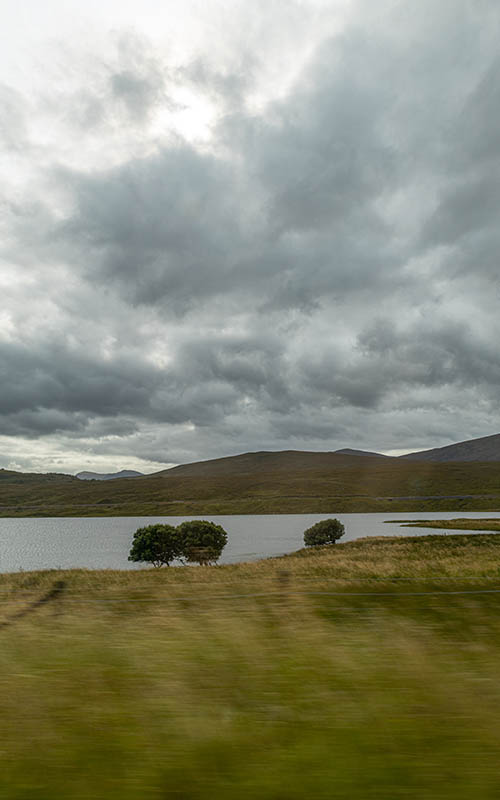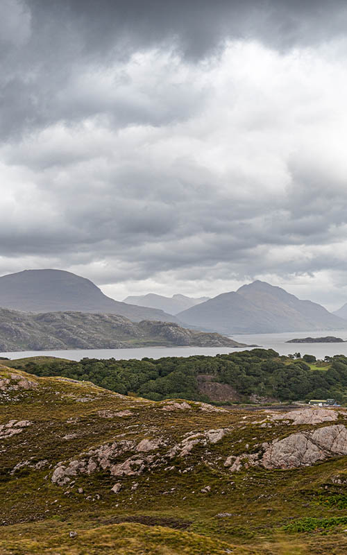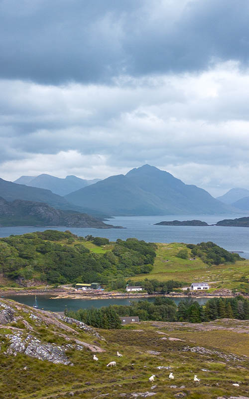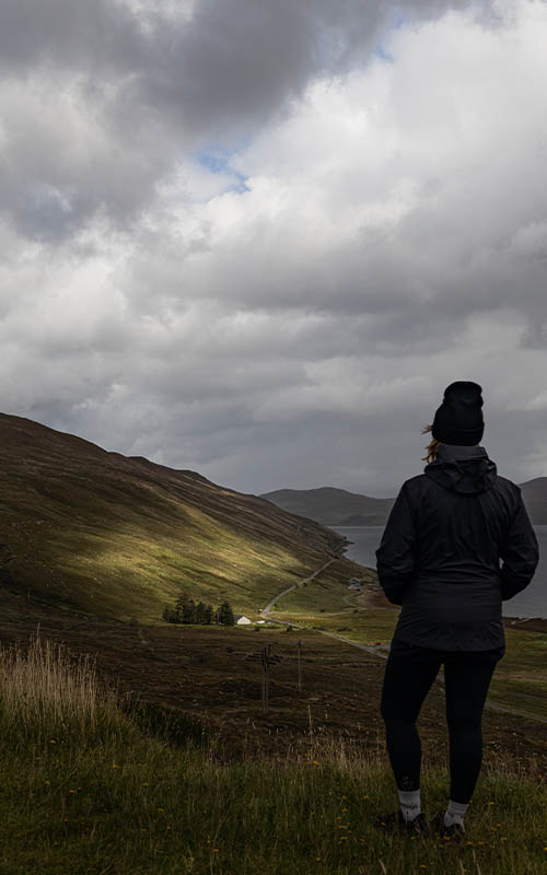 Zunächst ging es gen Westen über den „Bealach na Bà Pass“. Wir hatten in wirklich jede Richtung einen gigantischen Ausblick. Wasserfälle und Flüsse haben sich über die Zeit tief ins Gestein gegraben. Am höchsten Punkt der kurvigen Straße hielten wir an, um einen Blick hinunter ins Tal zu genießen. Zum Drohne fliegen war es eindeutig zu windig, doch auch vom Boden aus war die Aussicht spektakulär. Während wir weiter fuhren, stellten wir fest, dass sich nicht nur das Wetter, sondern auch die Landschaft alle paar Kilometer veränderte. Gerade noch vorbei an mächtigen und kargen Felsen, wartete hinter der nächsten Kurve schon ein Hügel, auf dem ein satt grüner Nadelwald wuchs. Wir konnten gar nicht aufhören, ununterbrochen Fotos aus dem Fenster zu schießen. Nach einer dreistündigen Fahrt erreichten wir das an der westlichen Küste gelegene Fischerdorf Applecross Sands. Dort kehrten wir in ein kleines Café ein und gönnten uns Kaffee und Flapjacks. Lisa betonte immer wieder, dass das Wetter nicht den typischen Sommer in Schottland widerspiegelt. Normalerweise sei es hier 10 Grad wärmer, es gebe wenige Wolken und mehr Sonne. Für uns war es ehrlich gesagt genau so, wie wir uns Schottland vorgestellt hatten: leicht verregnet, rau und „dramatisch“. Einfach wunderschön.