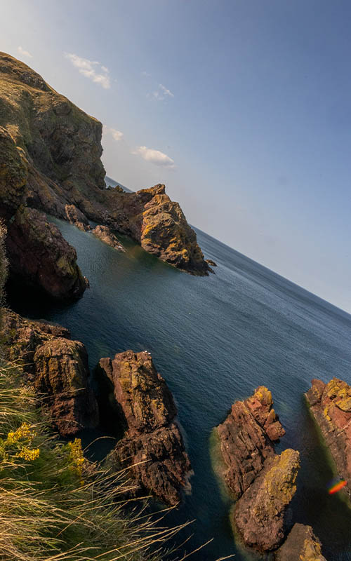 Zurück „an Land“ fuhren wir über die Grenze auf die schottische Seite nach „St. Abbˋs Head“. Das 78 Hektar große Naturschutzgebiet an der schottischen Nordseeküste ist von mehreren Wanderwegen durchzogen und für Besucher frei zugänglich. Wir parkten unser Auto am Informationszentrum und entschieden uns für eine knapp zweistündige Tour entlang der Küste und über Schafweiden. Der Ausblick an der Steilküste war spektakulär. Unglaublich, wie blau und klar das Wasser hier an den Steinstränden ist. Man könnte es glatt mit einem griechischen Strand verwechseln, wäre da nicht der kalte Wind. Mit der richtigen Kleidung und dank durchgehendem Sonnenschein war es heute aber wirklich gut auszuhalten. Wir liefen über grasbewachsene Felsen entlang der Küste und spähten vorsichtig immer wieder über die Kanten die Klippen hinab. Wir hofften auf Seehunde oder Puffins, sahen aber nur Möwen und andere Wasservögel auf den Felsen sitzen. Aber auch ohne Tiere war die Aussicht wirklich toll. Die Farbe der Felsen war rötlich mit gelben Elementen und leuchtete richtig vor dem blauen Meer. So eine mega Aussicht hatten wir wirklich nicht erwartet. Wir liefen von Hügel zu Hügel bergauf und ab und konnten uns kaum satt sehen.