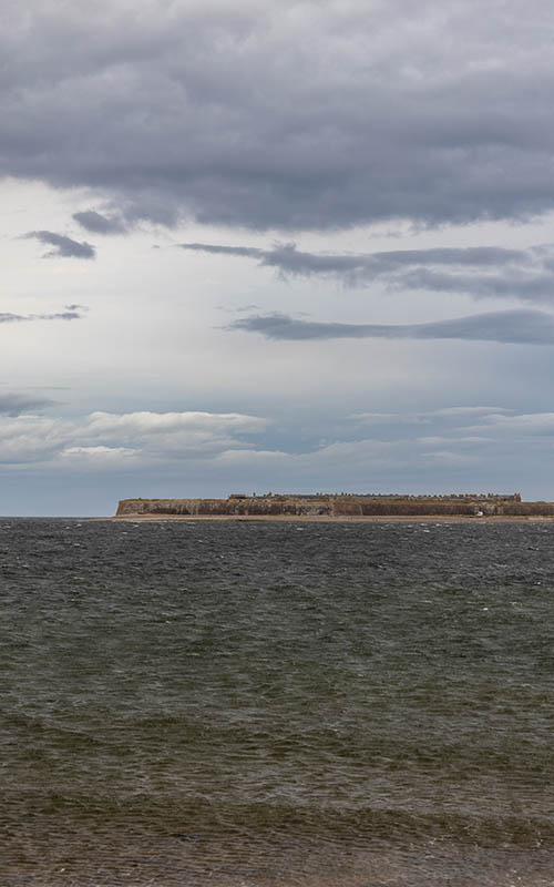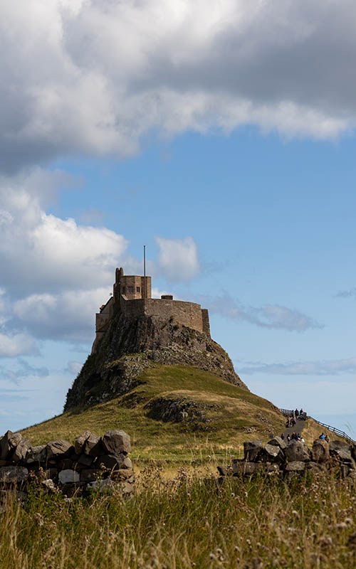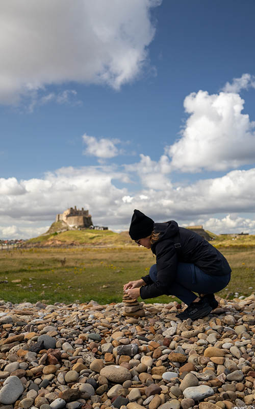 1540 wurde auf einem steilen Hügel am Meer das „Lindisfarne Castle“ errichtet. Es steht nach wie vor und kann besichtigt werden. Wir begnügten uns mit der Burg als Fotomotiv. Bei strahlendem Sonnenschein sah es toll zwischen den Wiesen und dem Meer aus. Ein Pfad führte uns einmal um die Burg herum am Steinstrand entlang. Dort baute ich noch einen kleinen Turm aus flachen Steinen für eine extra Portion Glück (davon kann man schließlich nie genug haben). Nach dem Rundweg um die Burg liefen wir vorbei an Fischerbooten, Krabbenfang Körben und Fischerhütten ins Zentrum der Insel. Dort besuchten wir noch die mittelalterliche Kirche mit Friedhof und schauten uns die Ruinen des ehemaligen Klosters an. Das Museum ließen wir aus und gingen dafür lieber noch einen Kaffee trinken. Nach knapp 3 Stunden hatten wir alles gesehen und düsten über die Zugangsstraße zurück aufs Festland, bevor die Flut kam. Teilweise stand das Wasser schon in Pfützen auf der Straße und beim Durchfahren spritzten hohe Fontänen auf.