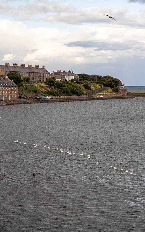 Die Stadtmauer, die schon im 12. Jhd. unter König Edward I. errichtet wurde, steht dank jahrhundertelanger Reparaturen bis heute. Über sie kann man am Meer entlang laufen. Die Stadtmauer verfügt noch über Aussparungen für Kanonen und diente zum Schutz vor Angriffen von der Seeseite. Im Meer unter uns erspähten wir ein paar Schwäne, die in einer Linie aufgereiht hintereinander her schwammen. Es kamen immer mehr dazu und alle schwammen geordnet hintereinander Richtung Innenstadt. Sowas haben wir auch noch nicht gesehen!