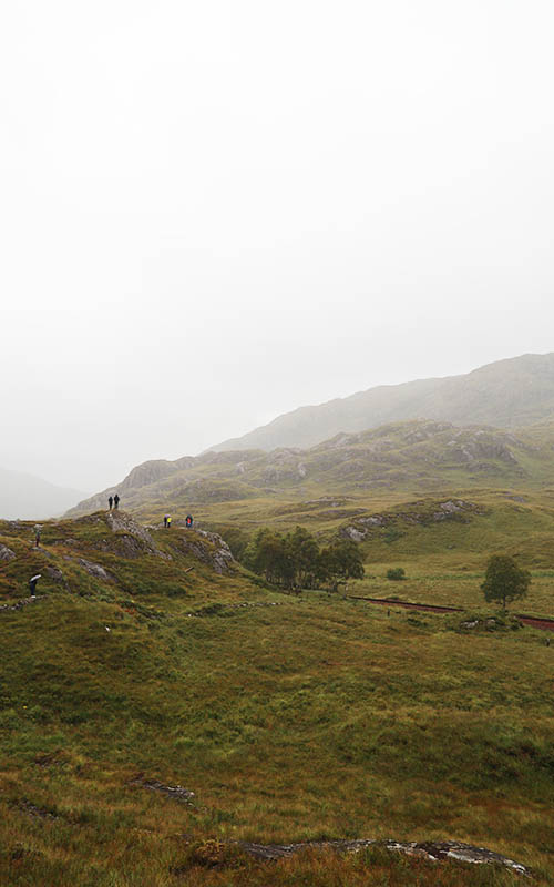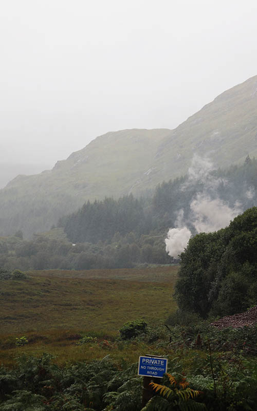 Innerlich hatten wir schon aufgegeben, denn mittlerweile war ein Fußmarsch zurück keine Option mehr. Tatsächlich führte die Straße, auf der wir fuhren, aber entlang der Zugstrecke und so witterten wir doch noch eine Chance. Wir ergatterten noch einen Parkplatz an der Straße, die bereits gut voll geparkt war. Viele Touristen waren über einen kleinen Abhang und das darunter liegende Gelände geklettert, um von einer felsigen Anhöhe aus auf die Gleise blicken zu können. Da wir nicht umsonst 2,5 Stunden hierher gefahren sein wollten, beschlossen wir, dass diese Option ohne Viaduct immerhin noch besser wäre, als den Zug gar nicht zu sehen. Wind und Regen peitschten an die Autofenster und so zogen wir uns so „dicht“ wie möglich an und liefen los. Beim Abstieg vom Parkplatz rutschte Chris auf dem nassen Gras aus und prellte sich das Steißbein. Mit nasser und dreckiger Rückseite lief er mit mir über das unter Wasser stehende Feld und wässerte seine Schuhe auch gleich noch richtig. Was für ein Mist! Meine Goretex Beschichtung auf den Schuhen ist leider auch schon nicht mehr komplett dicht. Nachdem wir über 30 Minuten im Regen und Wind auf den Zug gewartet hatten, drang das Wasser langsam durch unsere Jacken. Die müssten dringend neu imprägniert werden, denn dicht ist da mittlerweile nichts mehr. Unsere Laune wurde bei dem Wetter auch nicht besser. Wir harrten weiter aus, doch der Zug kam und kam nicht und viele Touristen gaben schon vor uns auf und stapften zurück zum Auto. Nach über einer halben Stunde im Wind und Regen gaben wir auch genervt auf. Wir liefen über das mittlerweile komplett unter Wasser stehende Gelände (jetzt wars auch schon egal) zurück zum Auto. Wir drehten die Heizung und Sitzheizung aufs Maximum und beschlossen, wieder heim zu fahren. Die Sicht in den Highlands war gleich Null und so hätte auch jede Alternative zum Zug wenig Sinn gemacht.