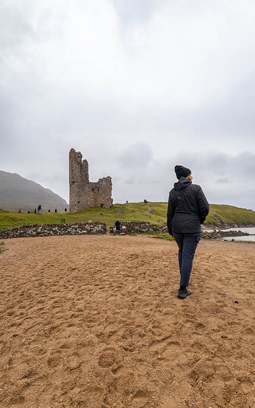 Die Fahrt zu unserem nächsten Stop führte uns an malerischen Tälern und Seen vorbei. Wir konnten trotz dichter Wolkendecke einen Blick auf beeindruckende Berge, wie den Stac Pollaidh werfen. Wir schlängelten uns die immer enger werdenden Straßen entlang Richtung Norden, bis wir eine weitere tolle Sehenswürdigkeit erreichten: Die Ruine des „Ardvreck Castle“. Direkt vor einem Berg am Wasser gelegen, bot sie einen großartigen Anblick und auch die Touristenzahl hielt sich aufgrund der Abgelegenheit in Grenzen. Generell stellten wir fest, dass es auf den Straßen eher ruhig zuging. Das war anscheinend vor allem in den letzten Jahren nicht immer der Fall. Während des Corona Lockdowns hatten viele Touristen, wie auch Einheimische den Drang, sich ein Wohnmobil zuzulegen und damit in die Highlands zu fliehen. Das führte jedoch dazu, dass die Strände, Wege und Straßen übermäßig stark mit Müll und Ausscheidungen verschmutzt wurden, was wiederum zur Folge hatte, dass z.B. Exkursionen von Schulklassen an Strände wegen Gesundheitsrisiken nicht stattfinden konnten. Für uns unvorstellbar, aber während der Coronazeit herrschte wohl überall das Chaos.