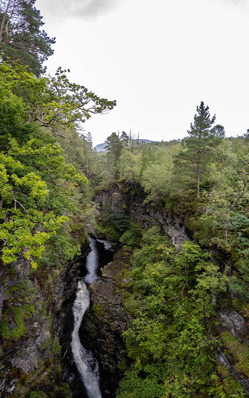 Chris verträgt das schottische Bier wohl nicht so gut 😀 Obwohl er gestern nur drei hatte, konnte er nicht so gut schlafen und fühlt sich heute morgen ein bisschen neben der Spur. Darum durfte er beim heutigen Ausflug vorne im Auto neben Lisa sitzen. Zusätzlich begleitete uns heute Lisas Freundin Paula. Sie hatte unsere Bilder und Videos auf Instagram gesehen und wollte uns unbedingt kennenlernen. Wir hatten heute wieder einiges geplant! Es ging ein bisschen weiter in den Norden als bei der letzten Runde vor zwei Tagen. Schnell wurde uns wieder vor Gesicht geführt, wie viel Unterschied ein paar Kilometer in diesem Land machen! Alles sah ganz anders aus, aber nicht weniger beeindruckend. Unser erster Stop war eine Hängebrücke im „Corrieshalloch Gorge National Park Reserve“. Vom Parkplatz aus liefen wir ein Stück durch den Wald bis wir zu einer Hängebrücke kamen. Von ihr aus hatten wir einen tollen Blick in die darunter liegende Schlucht. Ein super Start in den Tag! Hier machten wir auch das erste mal Bekanntschaft mit der wohl nervigsten Plage in Schottland: Midges! Kleine, fiese Biester, die gerne in großen Schwärmen auftauchen und mit Vorliebe das Gesicht attackieren. Sie stechen nicht wie Moskitos können aber beißen! Kein Wunder, dass hier viele Wanderer Hüte mit integrierten Fliegennetzen tragen. Man braucht sie wirklich!