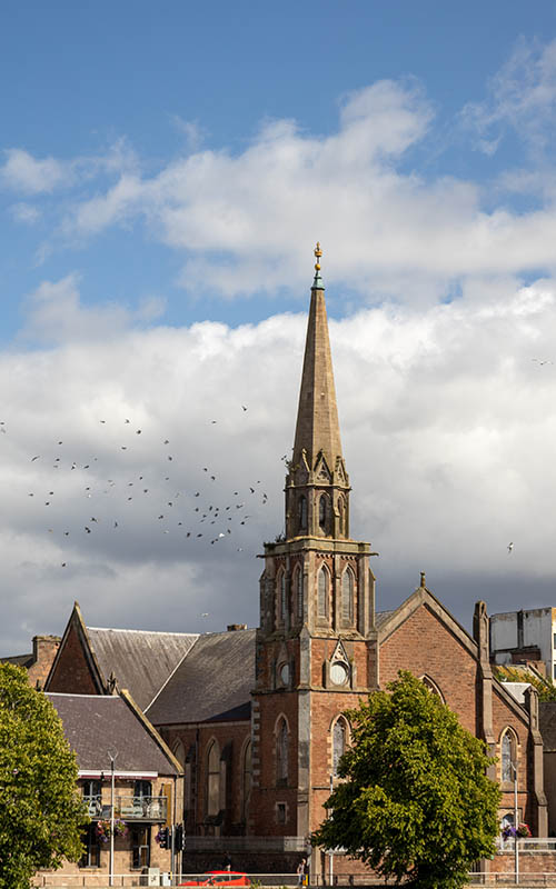 Wir fuhren zurück nach Inverness, stellten das Auto ab und gingen zu Fuß ins Zentrum der Stadt. Schon auf dem Weg sahen wir wunderschöne Straßenabschnitte mit typisch schottischen Steinbauten. Am Fluß, den wir auf einer Brücke überquerten, konnten wir vier Kirchen auf engstem Raum erspähen. Eine schöner als die andere. Wir erkundigten uns bei Lisa, warum es in Schottland so auffällig viele Kirchen gibt. Das liegt einfach daran, dass es hier viel mehr Glaubensgemeinschaften und Splittergruppen gibt als zum Beispiel in Deutschland. Und da jede natürlich ihr eigenes Gotteshaus benötigt, wird man kaum ein Dorf finden, in dem es nicht mindestens eine Kirche gibt.