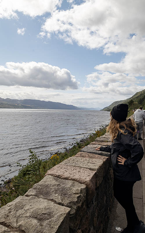 Es ging auf Monstersuche! Da sich Loch Ness nicht weit von Inverness entfernt befindet und ein Besuch am berühmtesten See Schottlands auf jeder To Do Liste nicht fehlen darf, fuhr Lisa mit uns einmal um den See herum. Am beliebten Strandabschnitt gab es keine Parkplätze mehr, aber das machte uns nichts. Wir wollten sowieso nicht zu sehr zurück in die Touristenströme und so sahen wir uns den See vom Auto aus an. Ab und zu hielten wir auch an einer der vielen Parkbuchten, um Nessie zu erspähen. Chris behauptet zwar, dass er etwas seltsames im Wasser gesehen hat, aber ein Beweisfoto hat er nicht geschossen 😀 Der Fluch des Sees… Das Wetter war entgegen der Vorhersage (der wir ja schon lange nur noch wenig Glauben schenken) ausgezeichnet. Über dem See wechselten sich Wolken und Sonne ab und wir können tatsächlich nachvollziehen, wie einem der Verstand bei Wellen und Licht- und Schattenspiel vielleicht einen Streich spielen könnte. „Loch“, das schottische Wort für „See“, wird übrigens nicht „Lock“ sondern mit „ch“ ausgesprochen. Damit haben wir Deutsche allen englischsprachigen Touristen auf jeden Fall etwas Voraus!