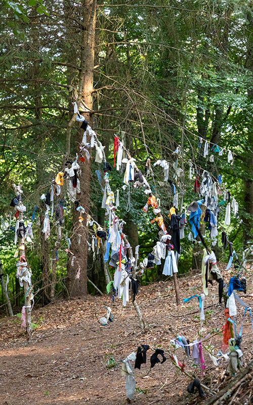 Wir hatten noch ein wenig Zeit bis zum Check-In, so zeigte uns Lisa noch einen kleinen, versteckten Ort im Wald, den wir (wie so viele andere Dinge) ohne sie wohl nie entdeckt hätten. Zwischen kleinen Bäumen führte ein unscheinbarer Weg zur sogenannten „Clootie Well“, einer kleinen Quelle. Rundherum um den Wasserlauf hingen Stoffstücke in den Bäumen und Sträuchern. Hierbei handelt es sich um eine Tradition, denn das Tränken von Stoffen und das anschließende Platzieren um die Quelle herum soll Glück bringen. Wir lieben die schottische Mythologie schon jetzt! Lisa erzählte uns von einem Zwischenfall ein paar Jahre zuvor: ein Mann fand die Clootie Well und machte es sich zur Aufgabe, den „Müll“ zu beseitigen, da er die Bedeutung nicht erkannt hatte. Der Aufschrei der Bevölkerung war damals natürlich groß, aber wir können vermelden: der Ort hat sich wieder gut erholt und Textilmangel herrscht definitiv nicht mehr.
