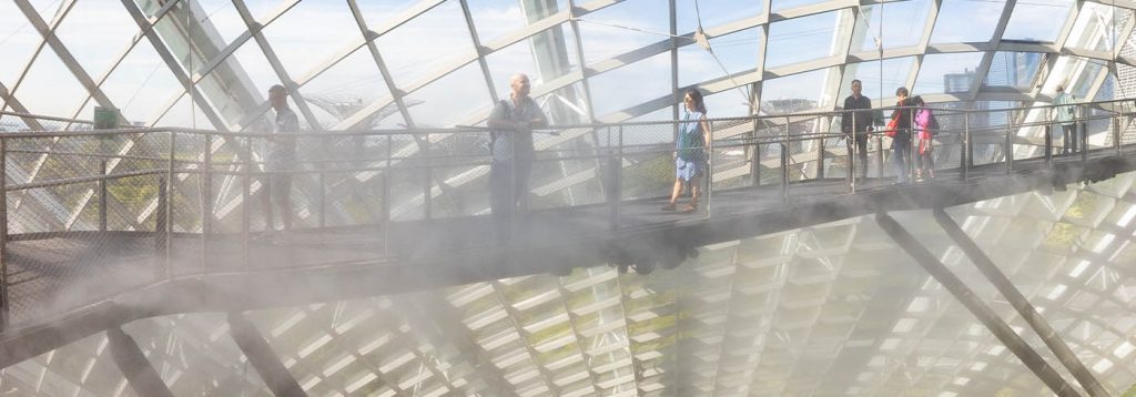 Frisch ausgeruht, starteten wir schon früh in den heutigen Tag. Unser Ziel: Die „Gardens by the Bay“. Sie bestehen aus einem großen kostenlosen Park und mehreren Gewächshäusern, die Eintritt kosten. Der Park ist 101 Hektar groß und gar nicht an einem Tag zu schaffen. Wir haben uns für den Vormittag den „Cloud Forest“ und den „Flower Dome“ vorgenommen. Zuerst ging es in den „Cloud Forest“. Unter der gigantischen Glaskuppel befindet sich ein riesiger begehbarer Berg in der Mitte. Er ist komplett mit tropischen Pflanzen bewachsen. Aus ihm stürzt ein Wasserfall 35 Meter in die Tiefe. Das Areal ist über Brücken und Treppen verbunden. Mehrmals täglich tritt Wasserdampf aus verschiedenen Öffnungen zwischen den Pflanzen aus. Der Nebel, der sich dann um den Berg bildet, sieht magisch aus und ist Namensgeber des gigantischen Gewächshauses. Die Blüten- und Pflanzenpracht war einfach überwältigend. Vor allem, wenn man bedenkt, dass wir vor 48 Stunden noch im kalten Deutschland gefroren haben.