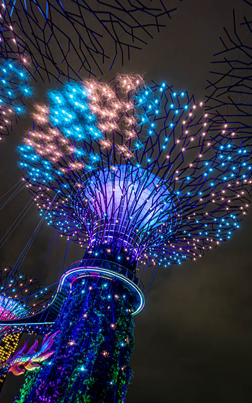Nach einem Nachmittagsschlaf ging es in der Abenddämmerung nochmal los zu den „Gardens by the Bay“. Hier findet abends im „Supertree Grove“ eine kostenlose Lichtshow statt. Leider fing es schon auf dem Weg dorthin an, zu regnen. Mit Schirm und Regenhülle für den Kamerarucksack ausgerüstet, ließen wir uns aber nicht davon abschrecken. Den Rest von Singapur schien der Regen auch nicht abzuhalten, denn zwischen den Supertrees war es ziemlich voll. Wir ergatterten einen guten Platz und warteten dort auf den Start. Die Supertrees sind pflanzenbewachsene Stahlgerüste mit Höhen bis zu 50 Metern. Sie fungieren als vertikale Gärten für die Aufzucht von seltenen Pflanzen. Zudem wird mit Photovoltaikanlagen Elektrizität für die Beleuchtung und die Kühlsysteme der umliegenden Gewächshäuser gewonnen. Sie sammeln auch das Regenwasser und bewässern damit die auf ihnen wachsenden Pflanzen.
