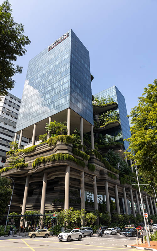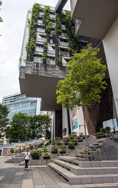 Die fast 6 Mio. Einwohner bestehen zum Großteil aus Chinesen, gefolgt von Malainen, Indern und anderen Ethnien. Fast jeder spricht hier fließend Englisch. Sie ist neben Malaiisch, Mandarin und Tamil die offizielle Sprache des Stadtstaats. Durch diese bunte Mischung haben sich im Laufe der Zeit charakteristische Stadtviertel gebildet. Eines davon, genannt „Little India“, haben wir heute besucht. Auf dem Weg dorthin sind wir von unserer Unterkunft durch das Parlamentsviertel gelaufen. Auch hier gibt es beeindruckende Gebäude zu bestaunen. Sofort fällt auf, das die Architektur hier immer einen Sinn und Zweck erfüllt. Es gibt kaum ein Gebäude, das keine vertikale Begrünung besitzt. Sie hilft, die Bauten und somit die ganze Stadt herunter zu kühlen, außerdem wird so der CO2 Ausstoß minimiert. Zusätzlich sehen sie einfach wahnsinnig toll und futuristisch aus. Unser Gebäudefavorit war die „School of the Arts“.