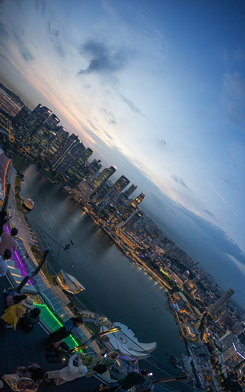 Nach unserem Nachmittags Break brachen wir am Abend noch einmal für unseren Showdown auf. Wir haben uns Tickets für das Skydeck auf „Marina Bay Sands Hotel“ gekauft. Natürlich darf man nur gegen Eintritt hinauf. Das ist aber immer noch viel günstiger, als sich eine Nacht in dem Luxushotel einzumieten, denn Hotelgäste dürfen natürlich umsonst aufs Deck. Der Ausblick auf die Gärten, den Hafen und den Rest der Stadt waren wirklich toll. Wir konnten von oben noch einmal die Lichtershow in den Supertrees bestaunen und sahen auch die Lichter und Lasershow im Hafenbecken. Um 21 Uhr wollten wir uns nochmal die Wassershow vom Boden aus ansehen.