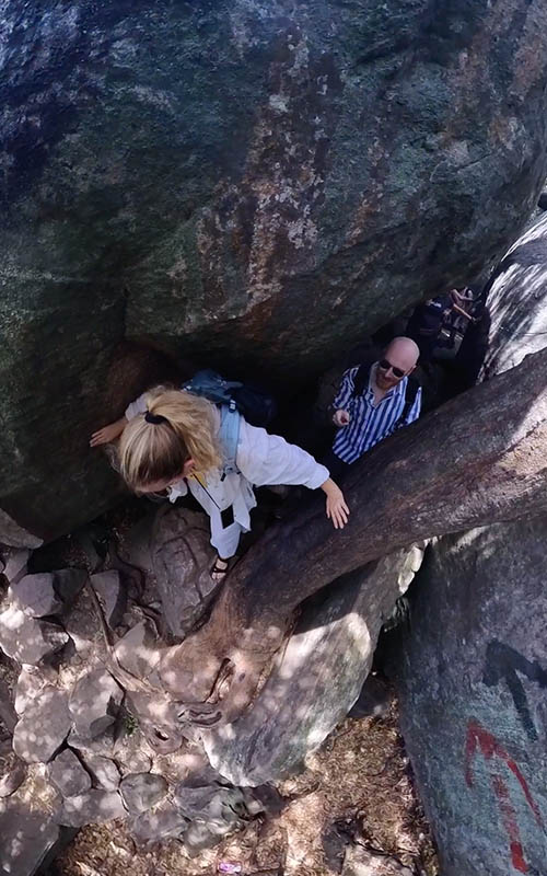 Der schwierigste Teil ist allerdings der Aufstieg zum Plateau des Gipfels. Man klettert über große Felsbrocken und quetscht sich durch Spalten, um hinauf zu kommen. Darüber nachdenken, was man sich da alles brechen könnte, sollte man besser nicht. Augen zu und hoch! Für den zusätzlich ausgestoßenen Angstschweiß wird man dafür auf dem Gipfel mit einer fantastischen Aussicht belohnt. Nicht nur der Blick auf den Löwenfelsen ist toll, auch die Rundumsicht auf den Dschungel ist fantastisch. Oben angekommen haben wir uns erstmal von der Sonne und dem kräftigen Wind trocknen lassen und die zittrigen Muskeln wieder entspannt. Spätestens jetzt merkt man, dass sich diese Tour nicht jeder Tourist antut. Es waren kaum Menschen auf dem Plateau, davon aber tatsächlich die meisten Deutsche. Die Welt ist eben doch ein Dorf 😀 Komischerweise gab es da oben auch zwei Straßenhunde! Wie die da hoch gekommen sind ist uns allerdings schleierhaft!