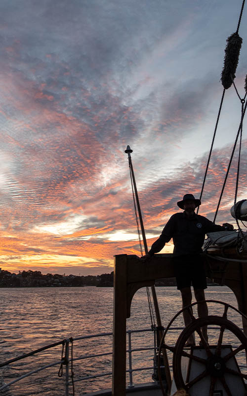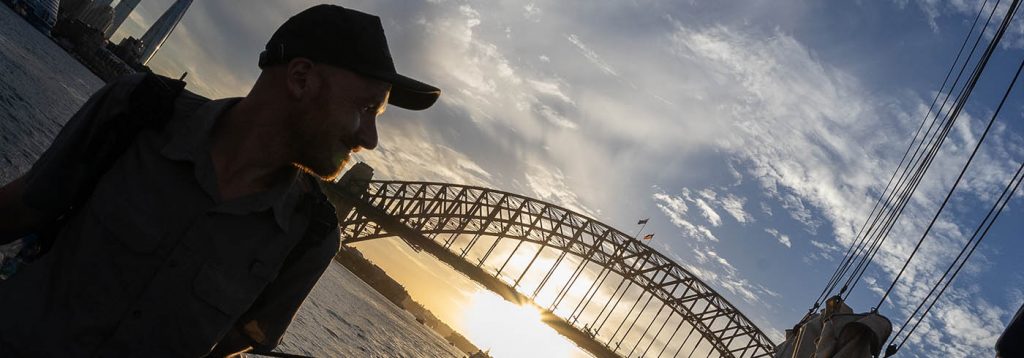 Gegen 17 Uhr erreichten wir den Ives Steps Wharf. Von dort aus sollte unser heutiges Highlight starten. Wir haben uns eine zweistündige Hafenrundfahrt auf einem Großsegler gebucht. Das schöne, alte Schiff, Baujahr 1949, ist von Dänemark nach Sydney gesegelt und seitdem in der australischen Stadt zuhause. Das An- und Ablegen des über 40 Meter langen Schiffes zu beobachten war sehr spannend. Die eingespielte Crew war sehr routiniert und typisch australisch, unglaublich freundlich, als wir an Bord gingen.