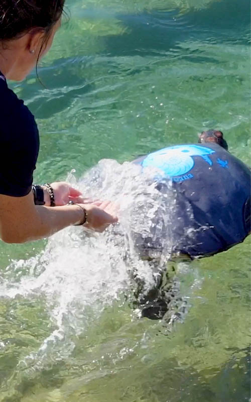 Die beiden großen Schildkröten, die im Moment dort zur Pflege sind, wurden beide durch Speere verletzt und ihr Panzer beschädigt. Das hat zur Folge, dass sich Luft unter ihrem Panzer sammelt und sie deshalb an der Oberfläche treiben. Diese Tiere können nur sehr schwer abtauchen und damit unter Wasser nach Nahrung suchen. Durch die hohe Sonneneinstrahlung trocknet ihr Panzer an der Wasseroberfläche schneller aus und wird deshalb täglich geölt und anschließend in ein T-Shirt gehüllt, das mit Wasser befeuchtet wird. Eine der Schildkröten ist blind, da ihr mit einem Speer die Augenhöhlen durchstoßen wurden. Die Pfleger haben sie daraufhin trainiert, das Maul zu öffnen, wenn sie oben am Panzer berührt wird. Sie muss per Hand gefüttert werden und kann nicht mehr ausgewildert werden. Wir durften Jade noch beim Messen, Wiegen und Untersuchen der jungen Schildkröten beobachten. Ihre Größe und Gewicht werden wöchentlich erfasst und notiert. Spannend und toll, so viel über diese Tiere zu erfahren und ihnen dabei so nah kommen zu dürfen.