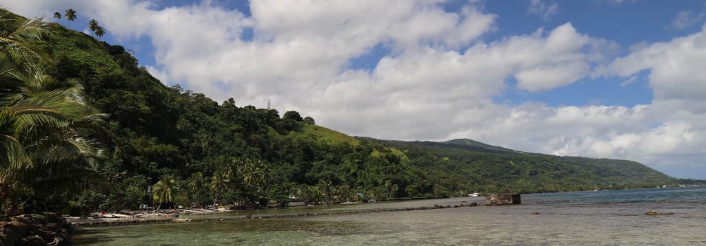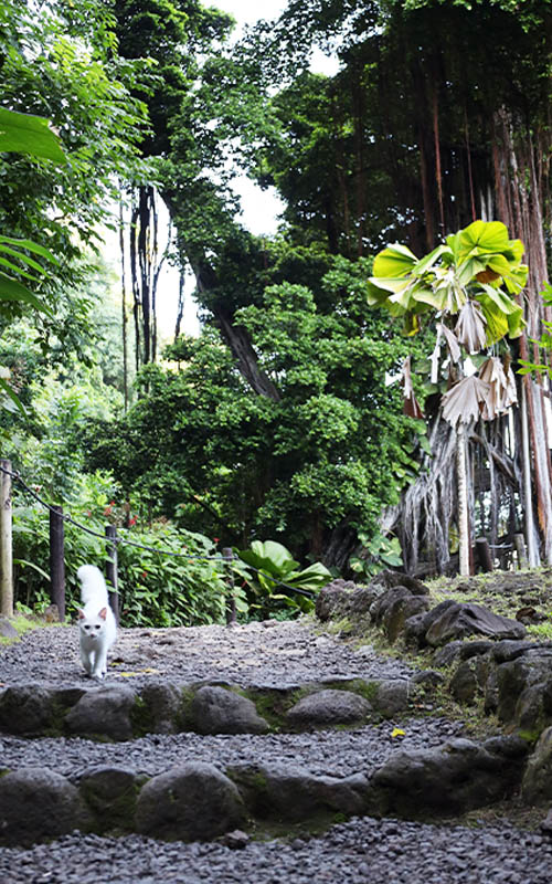 Dank der örtlichen Apotheke habe ich meine Halsschmerzen halbwegs in den Griff bekommen, trotzdem war mir heute nicht nach Bergsteigen bei 30 Grad zu Mute. Deshalb haben wir einen weiteren Ausflug entlang der Küste geplant. Wir stoppten bei den „Grottes de Mara’a“. Ein angelegter Weg führte uns dort von Höhle zu Höhle. Die steilen Felswände über den Grotten sind dicht mit tropischen Pflanzen bewachsen. Kleine Teiche und Wasserfälle rundeten das Bild ab. Eine schneeweiße Katze (wie auch immer das geht) begleitete uns ein Stück und löste mich teilweise als Fotomodell ab. Die tropische Pflanzenwelt wirkte nach all den bereits besuchten Ländern richtig vertraut. Würgefeigen und Bäume mit langen Luftwurzeln wie in Kambodscha und Sri Lanka, grüne Kletterpflanzen und Palmen wie in Vietnam und Thailand, Kiefern wie in Australien, aber auch hängendes Moos, wie wir es bis jetzt nur in Neuseeland gesehen haben. Tahiti scheint alles davon zu haben und zusätzlich noch jede Menge tropischer Früchte. Ein schöner Start in den Tag.