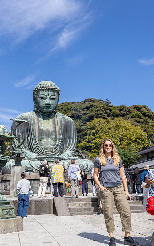 Den Tag haben wir einfach anders genutzt, denn wir haben ja noch viele Orte auf unserer Tokio Wunschliste. Kurzerhand sind wir nach Kamakura gefahren. Eine Stadt, die direkt am Meer in einer Bucht liegt, ca. 50 km von Tokio entfernt. Hier gibt es neben dem süßen Hafenstädtchen jede Menge Tempel und Schreine. Einer der bekanntesten ist der Kotoku- In, ein buddhistischer Tempel, in dem man den Großen Buddha (Daibutsu) besichtigen kann. Die sitzende Buddhastatue steht im Freien. Sie ist über 13 Meter hoch und im Inneren hohl. Man kann gegen eine Gebühr von umgerechnet 30 Cent ins Innere des Buddhas steigen. Für die Japaner gilt er als Nationalschatz und ist auch bei den Touristen sehr beliebt. Buddhas Sandalen kann man hier übrigens auch noch bestaunen (die echten versteht sich!) 😉