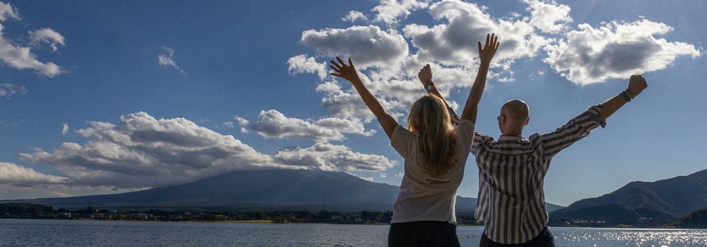 Ein neuer Versuch, den Fuji zu besuchen und anscheinend sind aller guten Dinge wirklich Drei. Früh morgens ging es wieder los. Um nicht unnötig Spannung aufzubauen: Ja wir haben ihn gesehen! Und wie! Es hat alles geklappt mit dem Bus und bereits auf der Fahrt konnte man hin und wieder einen Blick auf den schneebedeckten Gipfel erhaschen. Wir sind bis zum Kawaguchi See gefahren, einer der fünf Fuji- Seen in der Nähe des Berges. Der Fuji, der übrigens ein Vulkan ist, ragt mit seinen 3776 Metern als höchster Berg Japans regelrecht aus der Umgebung heraus. Die umliegenden Berge sind deutlich kleiner, komplett mit Bäumen bewachsen und durch und durch grün. Der bläulich wirkende, kahle Mount Fuji mit dem weißen Gipfel ist da schon ein wahrer Blickfang. Sein Reiz liegt neben der schönen Optik aber sicherlich auch daran, dass man immer bangen muss, ob man ihn überhaupt zu Gesicht bekommt.