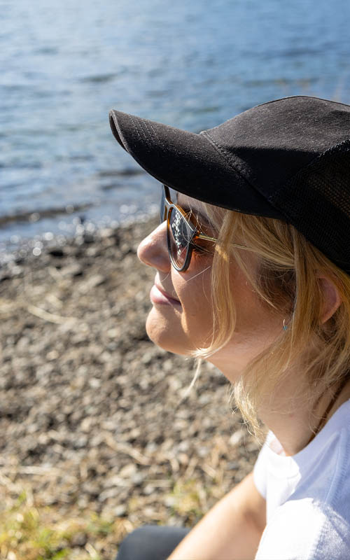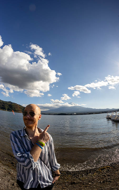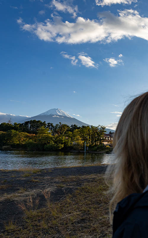 Als wir ankamen war es noch recht diesig und der Gipel versteckte sich hinter den Wolken. Im Laufe des Tages wurde die Sicht immer besser. Wir haben einen Spaziergang um den See gemacht und dabei immer den Berg im Blick behalten. Je nach Ausgangspunkt und Tageszeit schien sich der Fuji optisch zu verändern. Wir ertappten uns dabei, dass wir bei jeder neuen Wolkenformation wieder den Fotoapparat zückten, um noch ein Bild zu machen. Nachmittags hatten wir einen tollen Blick auf den schneebedeckten Gipfel. Die Wolken sahen aus,als wären sie tiefer gerutscht und bildeten eine Art Kränzchen unterhalb des Gipfels.