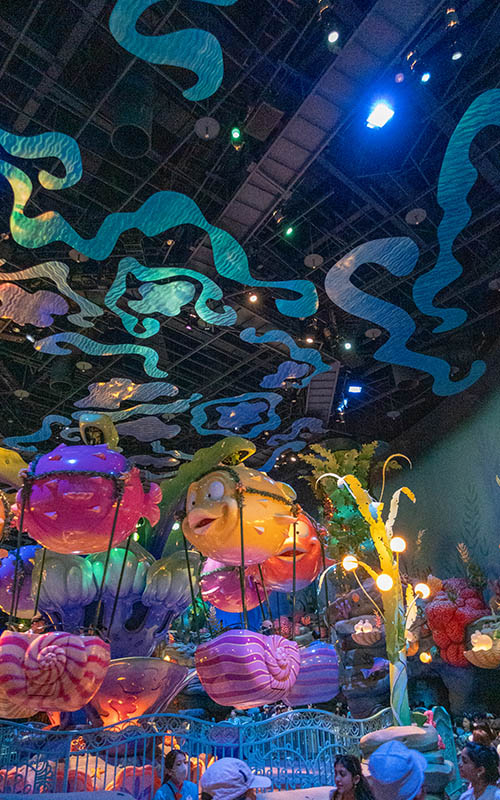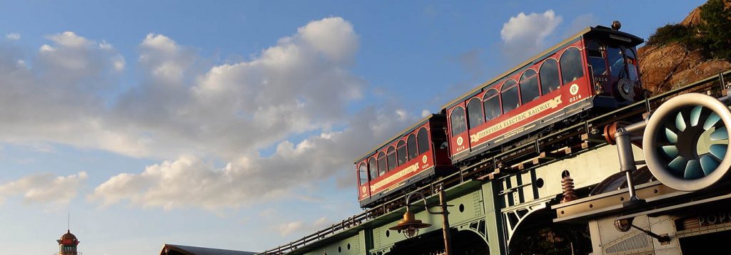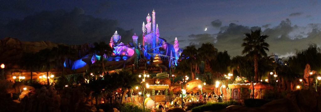 Hoch oben über dem Park fuhr eine elektrische Bahn im Stil der Jahrhundertwende, mit der man den Park umrunden konnte, genauso wie mit den Steamboats auf den Wasserstraßen, die den Park durchziehen. Gegen Abend kam durch die Beleuchtung eine tolle Atmosphäre auf. Lichterketten soweit das Auge reicht. Das Unterwasserschloss von „Arielle“ glitzerte und leuchtete in tollen Farben. Das perfekte Wetter trug seinen Teil zum Zauber bei.