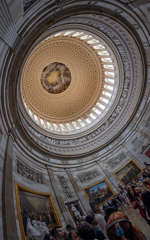 Dort hatten wir einen Timeslot für eine Führung durchs Innere gebucht. Da wir noch etwas Zeit hatten, umrundeten wir dieses Mal auch das Kapitol und schauten uns die Bronzestatuen am angelegten Teich an. Im Kapitol lief alles sehr koordiniert ab. Wir mussten uns rechtzeitig vor unserem Führungstermin anmelden und hatten anschließend noch die Möglichkeit, uns im Visitor Center umzuschauen. Nach einem 15 minütigen Kinofilm, bei dem wir beide beinahe erfroren wären (der Kinosaal wurde extrem heruntergekühlt), ging die Tour los. Mit Headsets ausgestattet folgten wir unserem Guide über Rolltreppen und durch verschiedene Gänge. Es herrschte großer Andrang und viele Gruppen bestanden aus 150- 200 Besuchern. In dem Gewusel war es gar nicht so einfach, die Gruppe nicht aus den Augen zu verlieren.