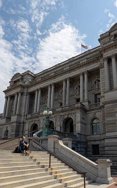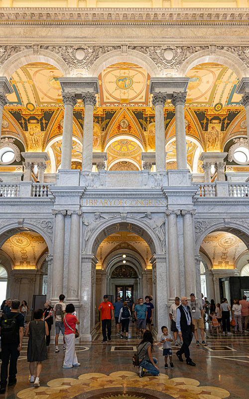 Heute ging es in die amerikanische Hauptstadt Washington DC. Der Weg dorthin war beschwerlicher als gedacht, denn sowohl in Baltimore, als auch im Umland sind die Straßen in extrem schlechtem Zustand. Alle paar Meter warteten tiefe Schlaglöcher und abfallende Straßenseiten auf uns. Wir kämpften uns durch den dichten Verkehr der Hauptstadt und fanden ein Parkhaus, das halbwegs bezahlbar war. Großer Pluspunkt: alle Museen und Gebäude sind kostenlos. Teilweise muss man sich anmelden, bezahlt aber nichts dafür. So war es auch bei der „Library of Congress“. Wir waren vor unserem Termin vor Ort (was gut war) und stellten uns in der langen Schlange der Besucher an. Selbst an einem Wochentag ist hier verhältnismäßig viel los. Die Library of Congress ist die größte Bibliothek der Welt! Insgesamt umfasst sie eine Sammlung von 175 Millionen Gegenständen. Darunter natürlich Bücher, aber auch Printmedien, Fotografien, Landkarten und Manuskripte.
